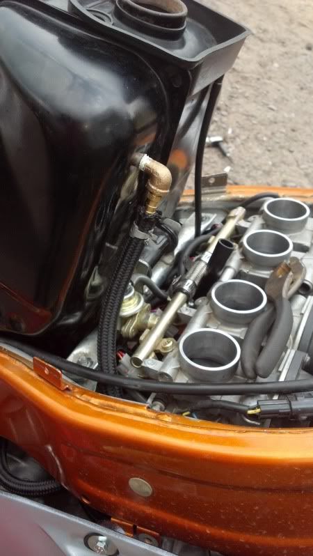 -Attach it to the inlet side of your ford fuel filter. (a ford filter was used because later on, i found that little paper element fuel filters physically don't pass enough fuel to meet the demands of the bike under high rpm and high load.